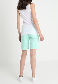 Femme portant un haut blanc sans manches avec le texte multicolore "Paradise" et un pantalon taille haute vert menthe à quatre boutons, les mains dans les poches.