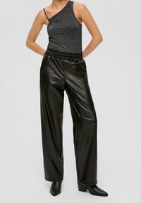 Pantalon large en similicuir noir avec une taille élastique. Texture lisse avec des détails de couture, associé à des bottines noires à talons.
