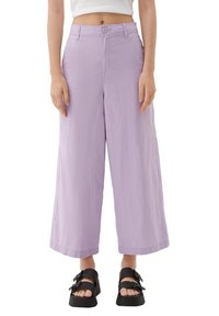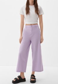 Pantalons larges lilas en tissu léger avec deux poches avant, une fermeture à bouton et une coupe décontractée, associés à un crop top blanc.