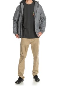 Homme portant une veste à capuche grise à fermeture éclair avec des poches zippées noires et un pantalon beige, debout devant un fond blanc.