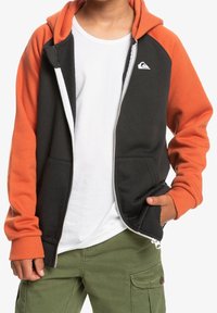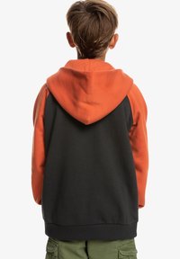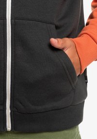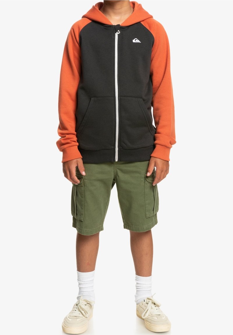 Sweat à capuche noir et orange avec zip sur le devant, poche kangourou, poignets côtelés, associé à un short cargo vert et des baskets crème.