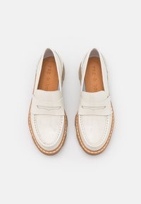 Mocassins en cuir verni blanc avec une épaisse semelle en caoutchouc beige et des détails cousus. Présente une bande de style penny classique sur le cou-de-pied.