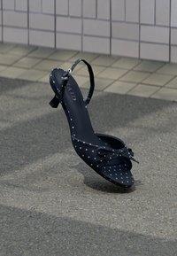 Chaussure à talon haut rouge à pois blancs avec bride à la cheville et nœud, placée verticalement sur un asphalt gris près d'un mur carrelé.