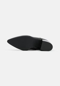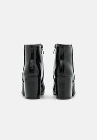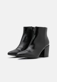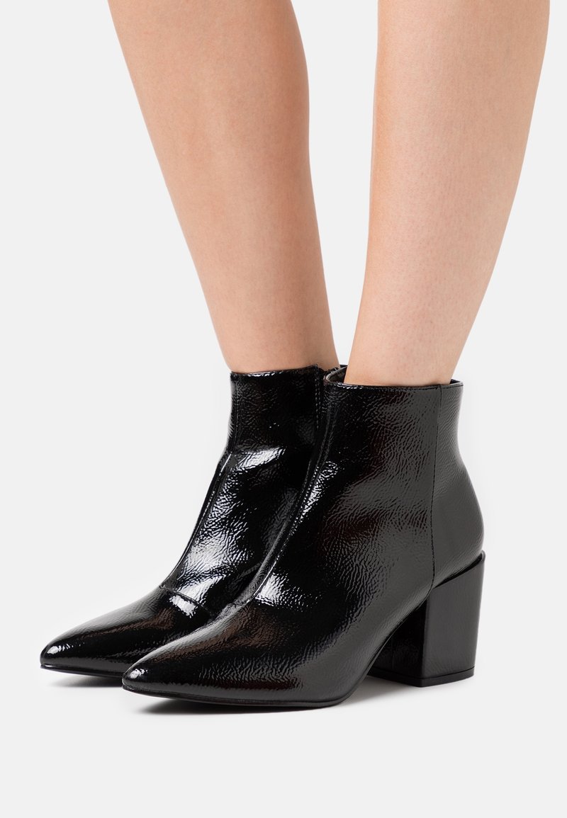 Bottes cheville noires brillantes avec un bout pointu, en cuir verni texturé et un talon épais. Fermeture éclair à l'arrière pour un enfilage facile.
