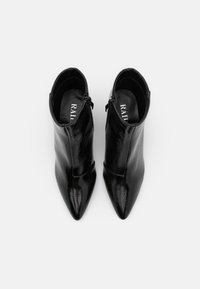 Bottine en cuir noir à texture lisse, embout arrondi et coutures discrètes. Elle possède un talon bloc bas et une languette à l'arrière.