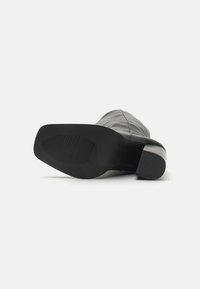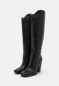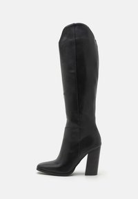 Bottes noires en cuir montant jusqu'au genou, avec un bout pointu et un talon haut épais. Texture lisse, design minimaliste avec détail de couture à l'arrière.