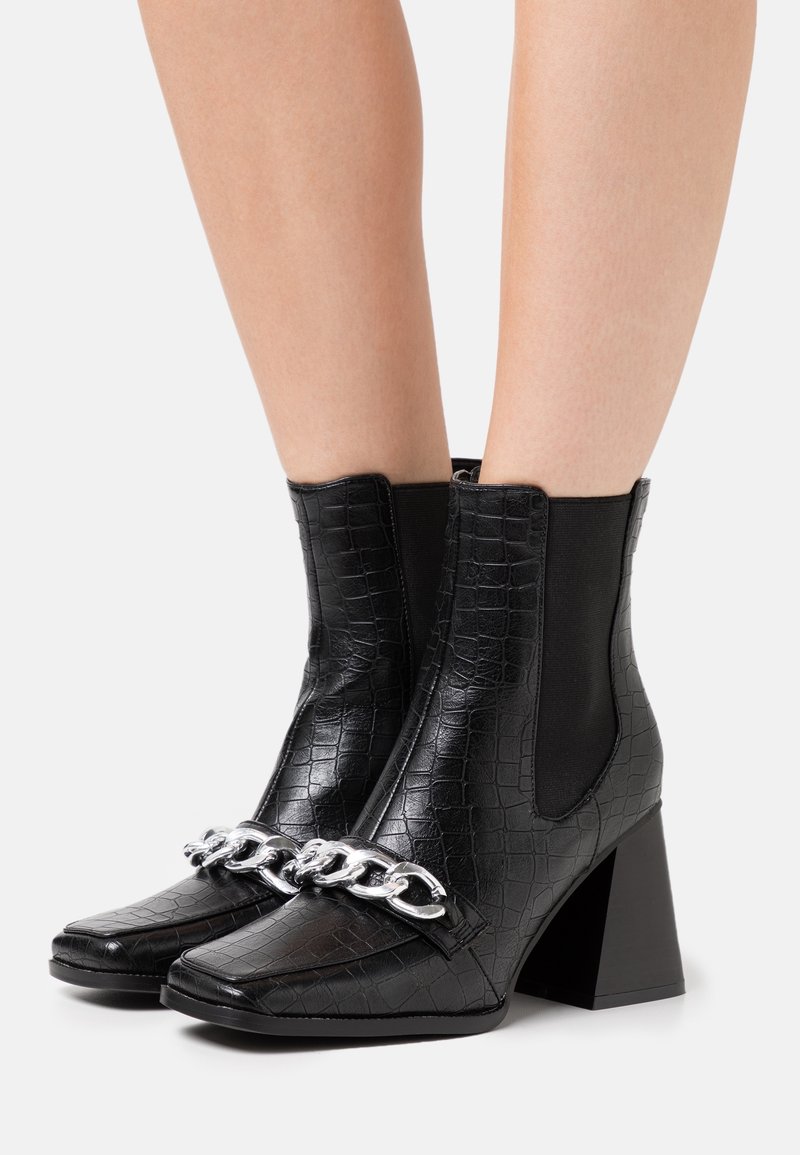 Bottines noires en cuir embossé crocodile avec un embout carré, ornées d'une chaîne métallique et d'un talon bloc épais.