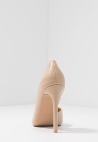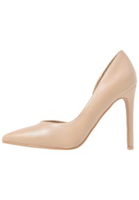 Chaussures à talons hauts beiges avec un bout pointu et des côtés ouverts. Confectionnées en cuir lisse, elles présentent un talon aiguille fin.