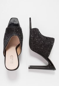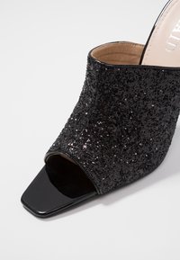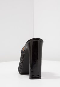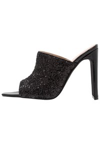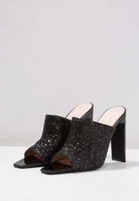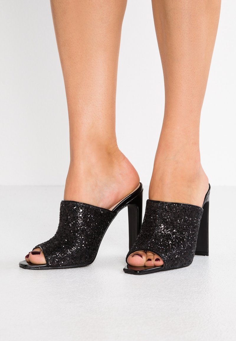 Mules noires ouvertes à bouts ornées de sequins noirs, avec un talon épais et un accent lisse et brillant autour de l'ouverture.