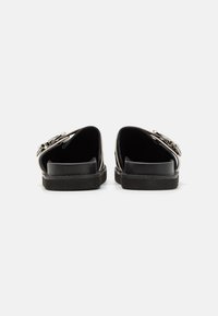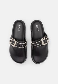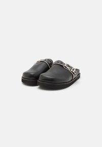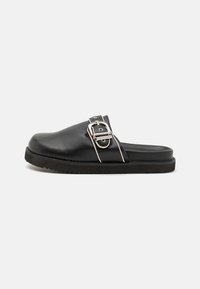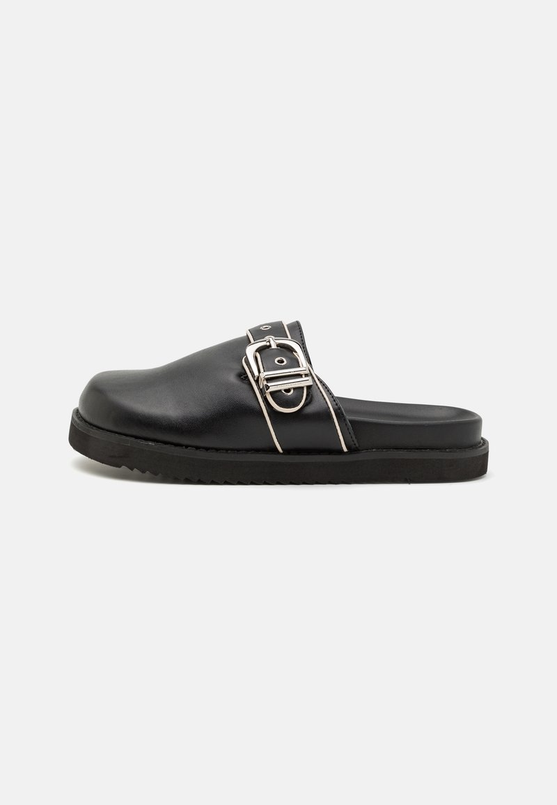 Mule noir à enfiler avec semelle épaisse, large boucle en métal argenté sur la lanière supérieure et bout rond fermé, présenté de côté gauche sur fond blanc.