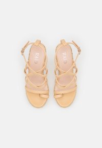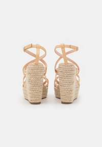 Sandales à talons compensés en toile beige avec une plate-forme en jute tressé. Les brides croisent sur le pied et disposent d'une boucle de cheville réglable.