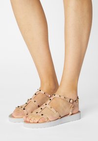 Sandales à lanières de couleur rose clair avec des clous dorés sur les lanières, dotées d'une semelle en caoutchouc blanche et d'un design ouvert au niveau des orteils, affichant une texture lisse.