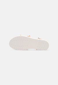 Sandales à plateforme blanches avec de larges brides croisées, une fermeture à boucle, et une semelle en caoutchouc texturé avec des rainures pour une meilleure adhérence.