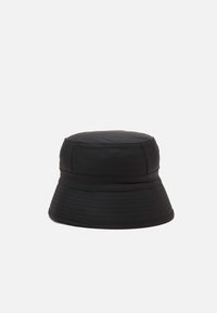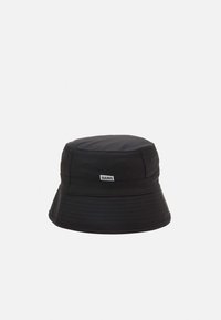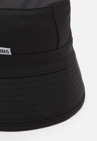 Chapeau seau noir imperméable avec coutures cousues et une petite étiquette blanche du logo Rains à l'avant.