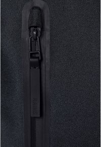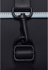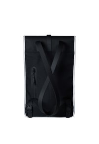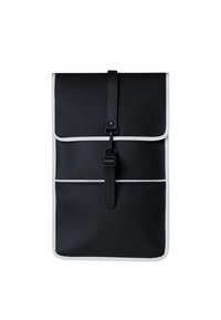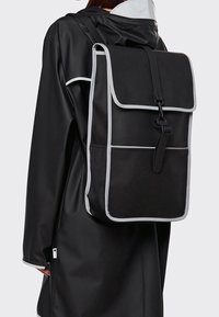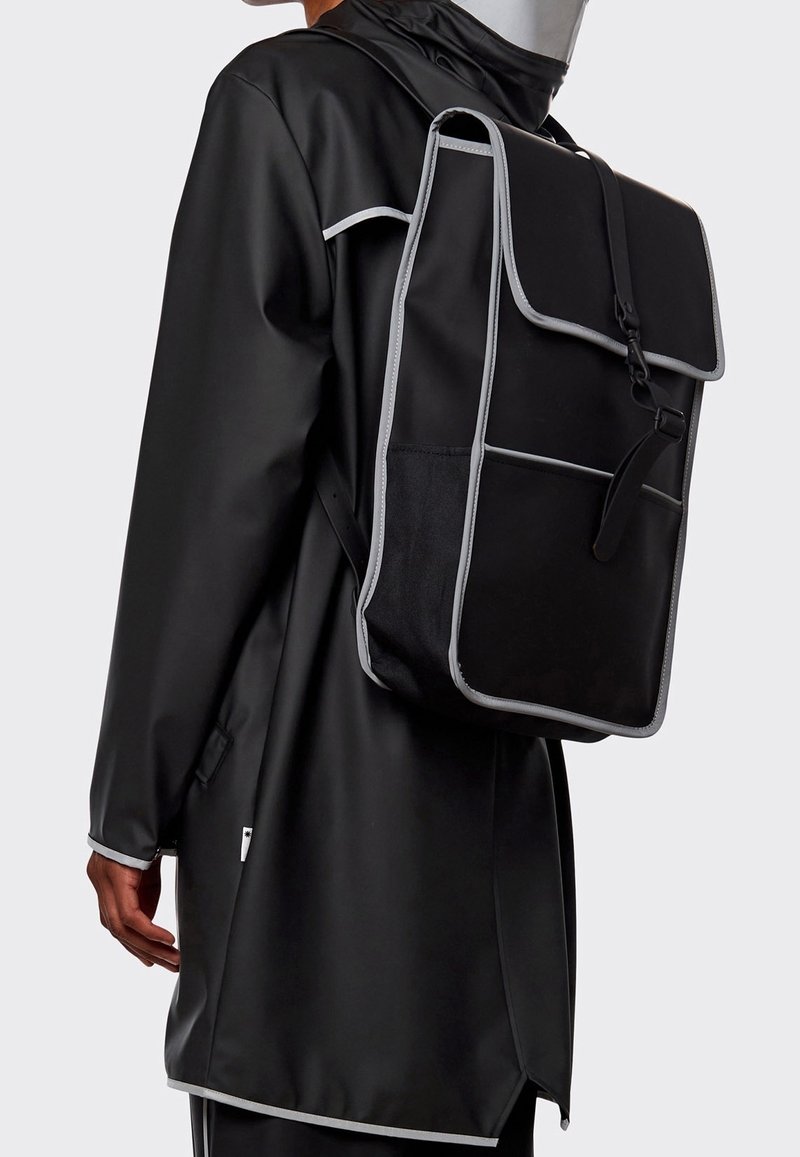 Personne portant un manteau imperméable noir avec un sac à dos rectangulaire noir, bordé de gris et fermeture à rabat frontale, vue de profil.