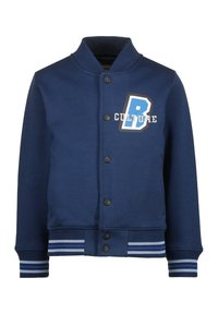 Veste universitaire bleu marine avec col, fermeture à boutons et poignets à rayures blanches. Présente un graphique "B" et le mot "CULTURE" en couleurs contrastantes.