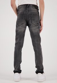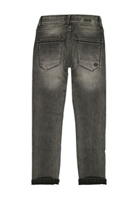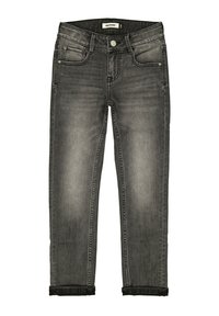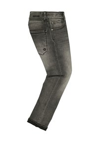 Jean slim gris foncé avec un effet délavé, design à cinq poches et légère usure aux plis. Porté avec une chemise blanche unie et des baskets blanches.