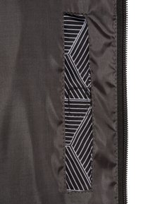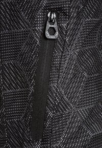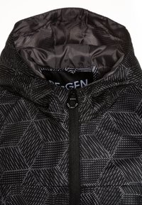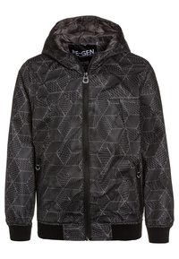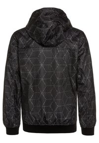 Veste à capuche noire avec un motif géométrique en gris. Dotée d'une fermeture éclair sur le devant, de poignets élastiques et de poches latérales. Doublure intérieure lisse.