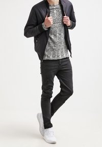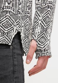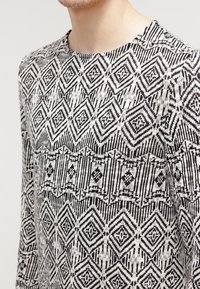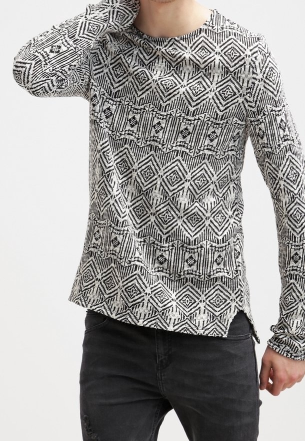 Personne portant un pull à manches longues noir et blanc à motifs géométriques et un pantalon noir.