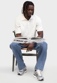 Jeune homme aux dreadlocks courts portant un polo à manches courtes blanc texturé et un jean bleu clair, debout devant un fond uni.