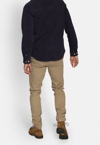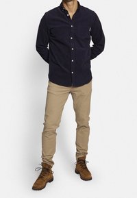 Homme portant un pantalon beige slim, des bottes lacées marron, et une chemise à manches longues foncée boutonnée, montré de la taille aux pieds.