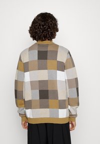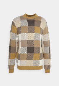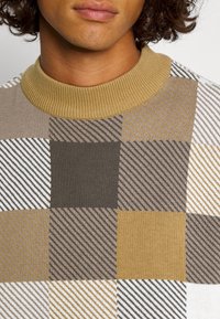 Pull marron et beige à motifs avec des rayures diagonales et un col côtelé. Présente une texture en tricot épais et une coupe décontractée.