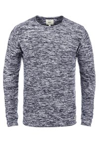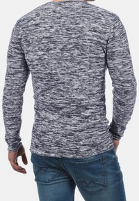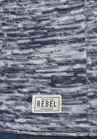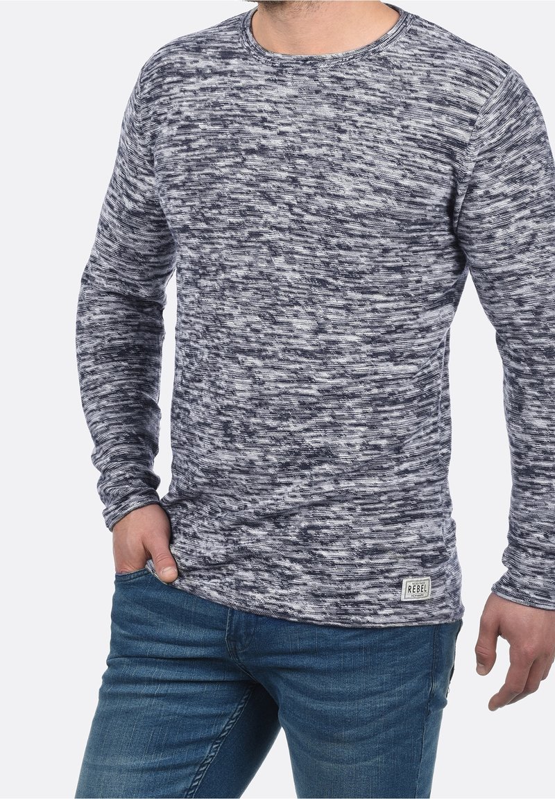Homme portant un pull en maille gris et noir à manches longues avec une petite étiquette rectangulaire "Rebel" près de l'ourlet et un jean bleu.