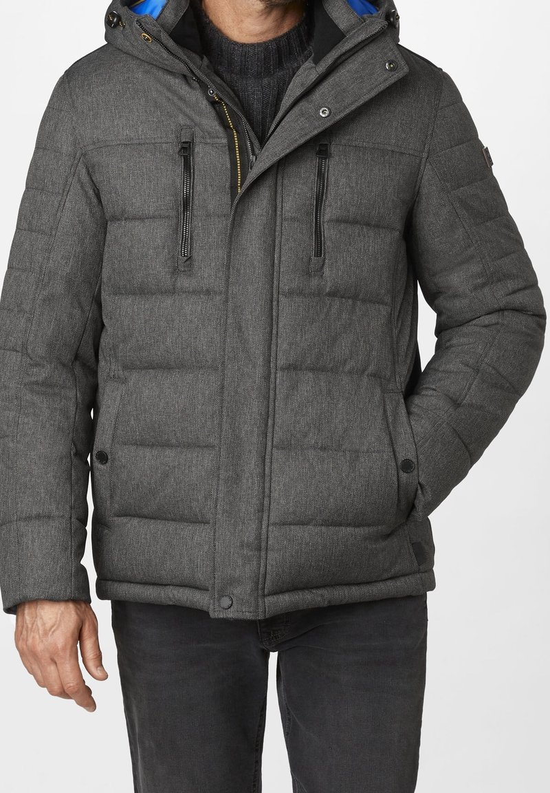 Homme portant une veste d'hiver matelassée grise avec des poches poitrine zippées et une capuche, associée à un jean foncé et un pull en laine noir.