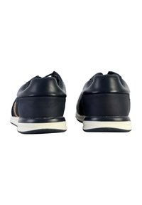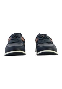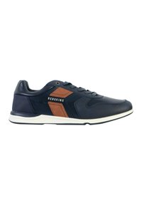 Baskets bleu marine avec dessus en cuir et tissu, accents orange et semelle blanche. Présente un système de laçage et un logo sur le côté.