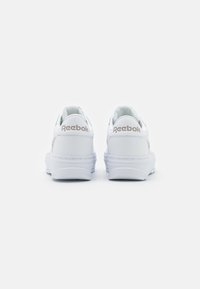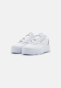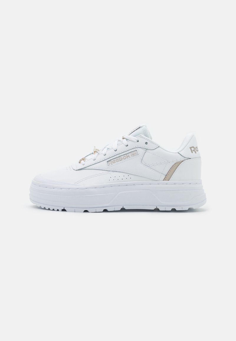 Baskets Reebok basses blanches à semelle épaisse, lacets à l'avant, avec des accents beiges sur le côté et le talon sur un fond uni.