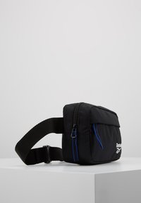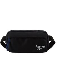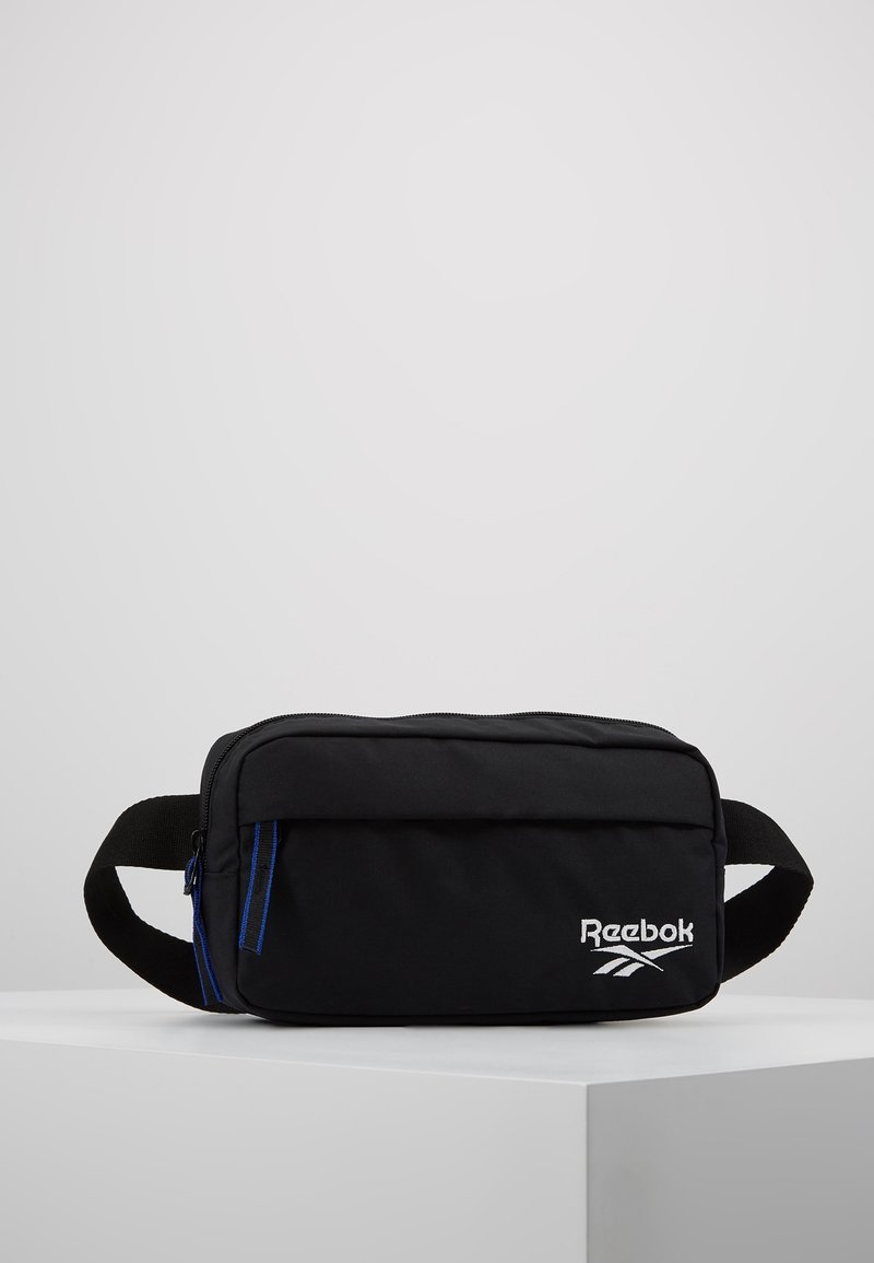 Sac banane Reebok noir avec compartiments à fermeture éclair et bandoulière réglable, posé sur une surface blanche devant un fond gris uni.