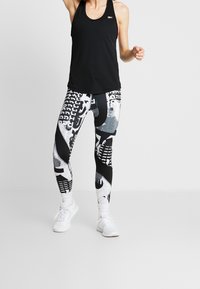 Débardeur de sport noir à encolure ronde, associé à un legging noir et blanc à motifs avec des dessins graphiques et des logos.