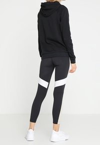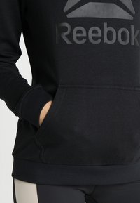 Sweat à capuche noir avec une poche kangourou et un logo Reebok texturé. Doté d'une capuche avec cordon de serrage et de manches raglan ; tissu doux et coupe décontractée.
