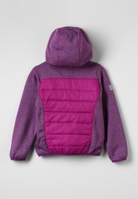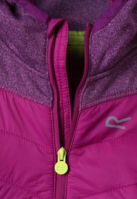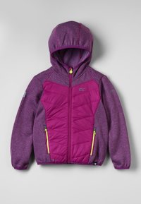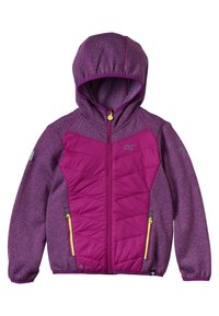 Veste zippée violette avec capuche. Caractéristiques d'un corps texturé et d'un panneau avant lisse et matelassé. Poches zippées en jaune contrastant.