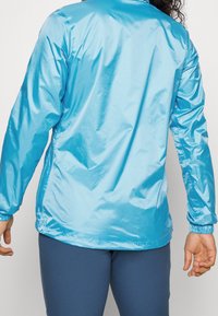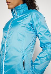 Veste bleu clair résistante à l'eau, avec un col montant, une fermeture éclair intégrale, des poignets élastiques et des poches latérales. Texture de tissu lisse et brillante.