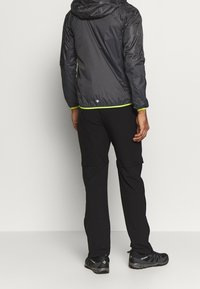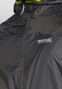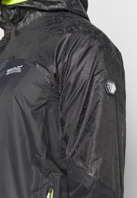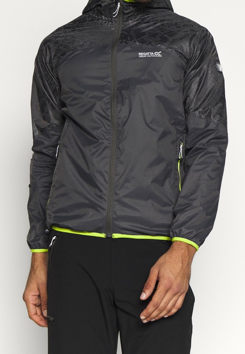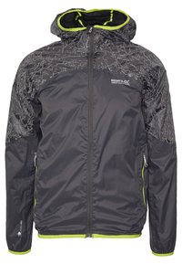 Veste noire légère avec une finition brillante, zip sur le devant et capuche. Accents vert fluo sur les poignets et l'ourlet. Dispose de poches latérales zippées.