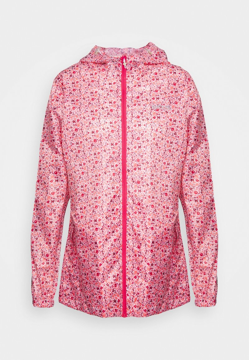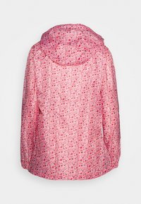 Veste légère à motif floral dans des nuances de rose avec une fermeture éclair frontale, des poignets élastiques et une capuche. Présente une finition brillante.