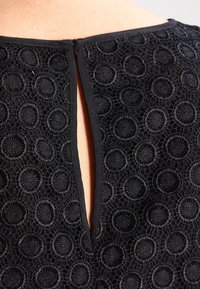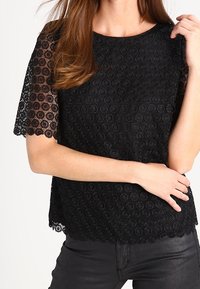 Haut en dentelle noire avec manches courtes présentant des motifs circulaires, un col rond et un ourlet festonné. Porté avec un pantalon noir.