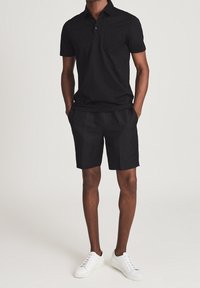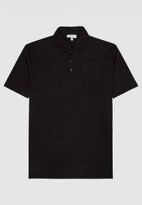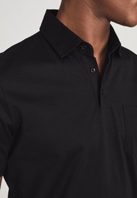 Polo noir en coton, avec un col, trois boutons et une poche poitrine. Manches courtes avec une coupe ajustée.