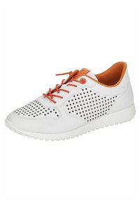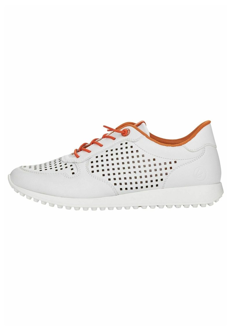 Baskets blanches perforées avec un accent orange sur les lacets et l'intérieur. Bout arrondi et semelle texturée avec de petits picots pour l'adhérence.