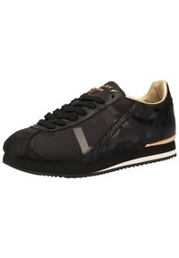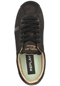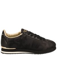 Baskets noires avec une tige en tissu texturé, des accents dorés métalliques, un bout rond, des lacets noirs et une semelle extérieure blanche. Détail du logo sur le côté.