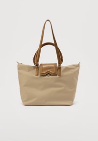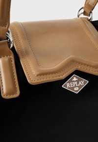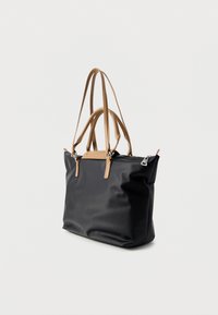 Sac cabas noir avec poignées en cuir marron clair et rabat, ornée d'une petite plaque métallique avec logo au centre devant.
