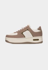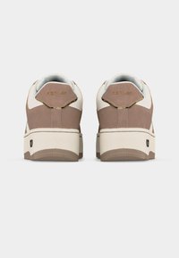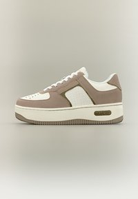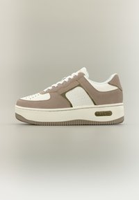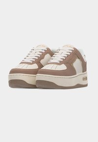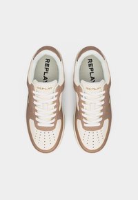 Baskets basses avec panneaux beige et blanc, détails perforés, lacets blancs, semelle épaisse blanche, et logo "REPLAY" sur le côté.