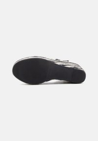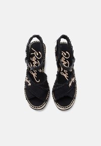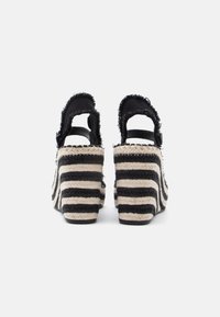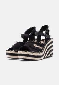 Sandale compensée noire à bout ouvert avec une plateforme en jute rayée, présentant un tissu effiloché et une bride à boucle. Logo brodé sur la tige.