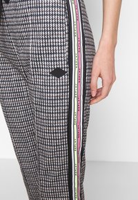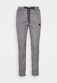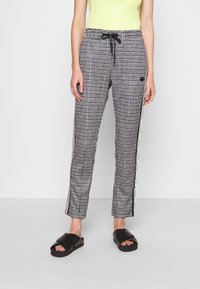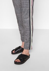 Pantalon à carreaux noir et blanc avec une taille à cordon de serrage, présentant des bandes latérales colorées en rose et vert, porté avec des sandales à enfiler noires.