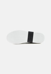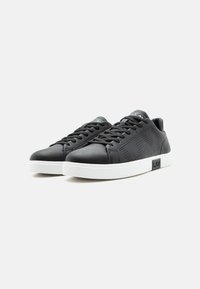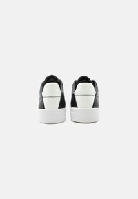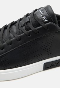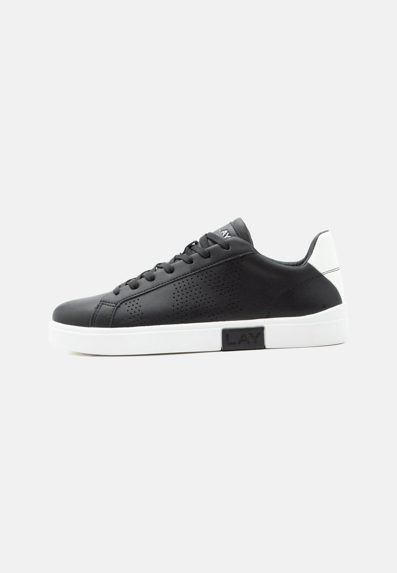 Baskets basses noires avec panneaux latéraux perforés, accent talon blanc, semelle blanche et étiquette noire "LAY" sur le côté de la semelle.