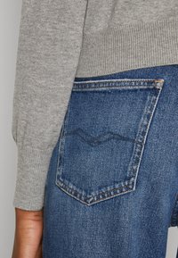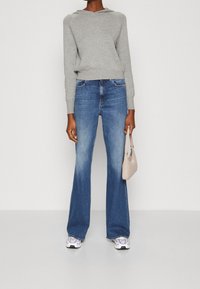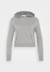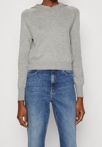 Hoodie gris tricoté à coupe décontractée, manches longues, ourlet côtelé, associé à un jean denim bleu.