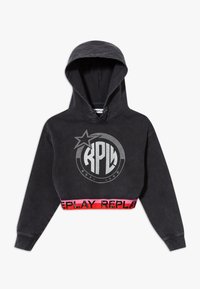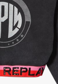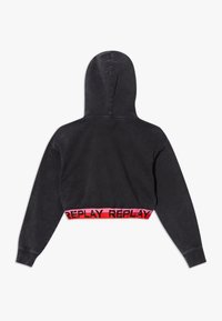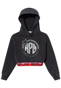 Haut noir raccourci avec un logo graphique argenté et une bande élastique rouge arborant le texte "REPLAY". Le matériau semble doux avec une texture délavée.