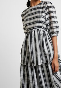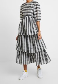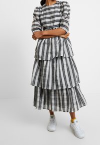 Robe rayée noire et blanche à volants, en tissu léger, assortie à des baskets blanches et des accents jaunes sur les chaussettes.