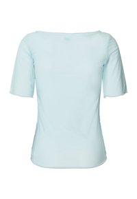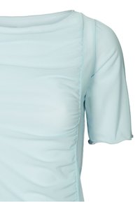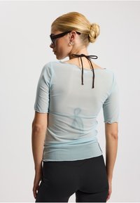 Haut de sport en maille bleu clair à manches courtes, détails froncés sur les côtés, associé à un short de cyclisme noir, modèle portant de grandes lunettes de soleil foncées.